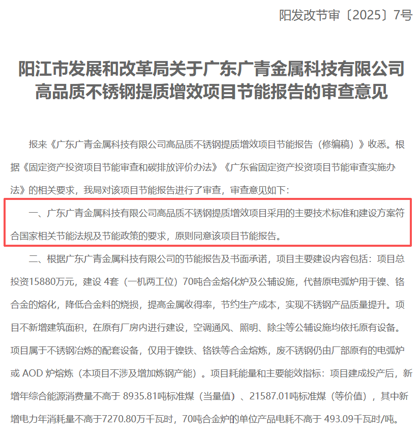 2025年10月15日,阳江市发展和改革局就广东广青金属科技有限公司高品质不锈钢提质增效项目节能报告作出审查意见,据显示,该项目节能报告获原则同意通过。